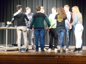 We met in the auditorium at 8.10am and students from each country had time to talk to their friends and teachers from their own country before work began for the day. The day started by each country playing the video presentations that they had recorded before they left for Germany. We had 5 videos, each one focusing on a different area in the project. The videos were very interesting. After this the German teachers put on a science show. A lot of excellent experiments were demonstrated at it. After this we were out into working groups and given new smart materials. These working groups had different materials including Newtonian Fluids, Superabsorbers, Ferrofluids, Hydrophobic Surfaces, Superinsulators, Conductive Paint, Memory Metals, Flourescence, Supercolling and Latent Heat Storage. My group are working with Conductive paint and we have to design and create a prototype for our own science show on Friday morning.